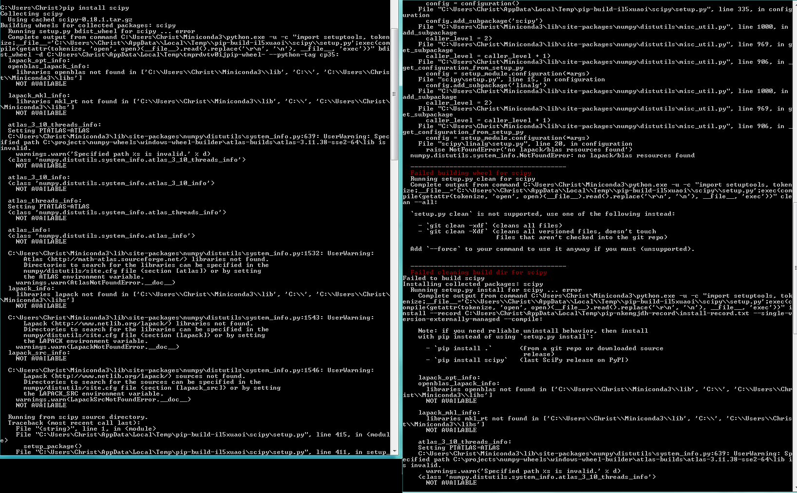 After testing my code, I get this: Import Error: No module named 'scipy' When I try to install scipy, it gives me an error (error picture attached) which doesn't give scipy a clean installation. Does anybody know how to install scipy for python3.5.2?