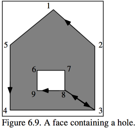 Figure 6.9 (6.11 in the book) shows how a face containing a hole can be captured in a face list. A pair of imaginary edges is added that bridge the gap between the outer edge of the face and the hole, as suggested in the figure.