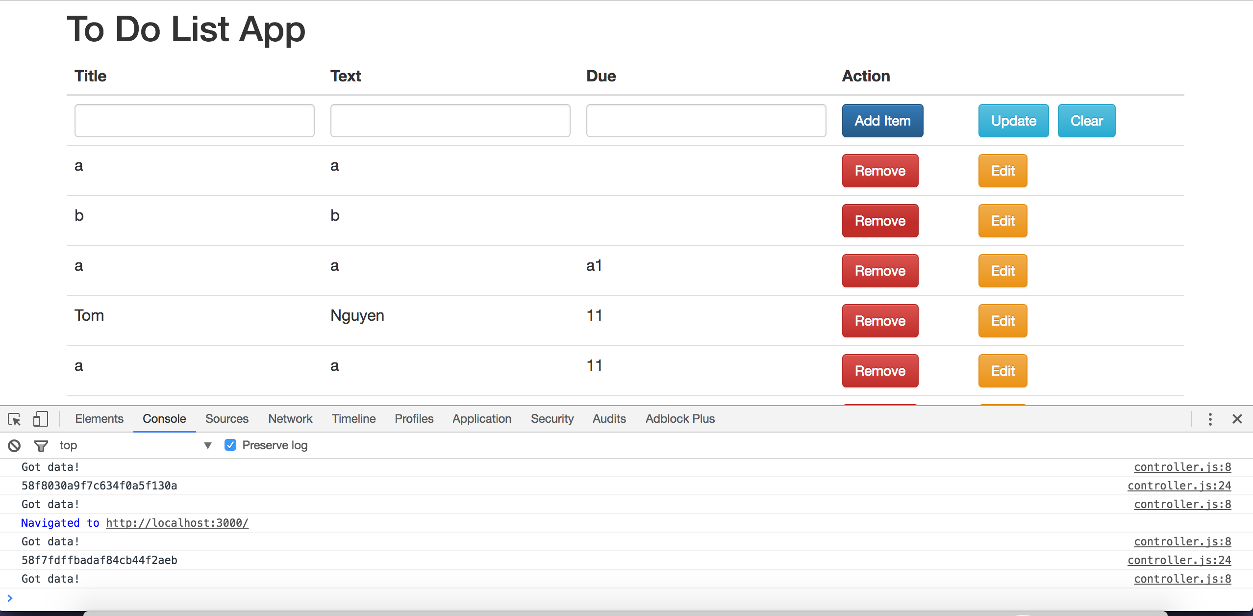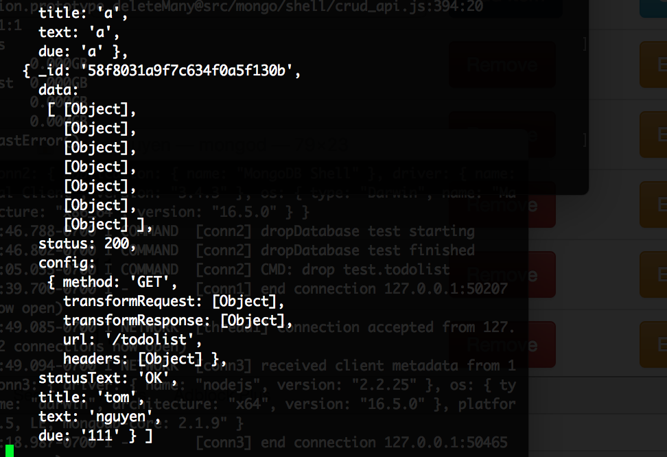 I was trying to add new stuffs to check my addItem function. Accidently, the code doesn't work and it creates a database in my mongodb database. I have tried db.todolist.dropDatabase(), but it doesn't work. The picture is when I just started the localhost:3000 on the webpage. I finally fix the code, but these datas are still in my mongo database. I couldn't delete or edit these datas as well. Please give me advises! Thank you |