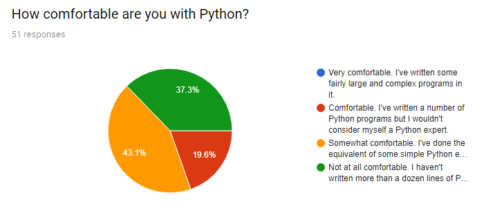 The first meetings of CS 4660 are this week. The MW class meets 10:00 - 11:15. The Sat class meets 9:30 - 12:15. We meet in the Active Learning Classroom (ET A129, not in Salazar Hall). Please upload a recognizable picture of yourself to your CSNS profile. The Python survey drew 51 responses. The results are attached. In light of the survey results, I've decided to devote the first week exclusively to Python. We will talk about the Intro to RL material next week. Don't forget. There will be a quiz every week. Weeks start with the Saturday class. (So the MW classes this week do not count as part of a week.) The Saturday quiz will occur at the end of class each week including this coming Saturday. The MW quiz will occur at the end of the Wed class each week -- except this Wednesday, which does not count as part of a week. See those of you in the MW class tomorrow morning.