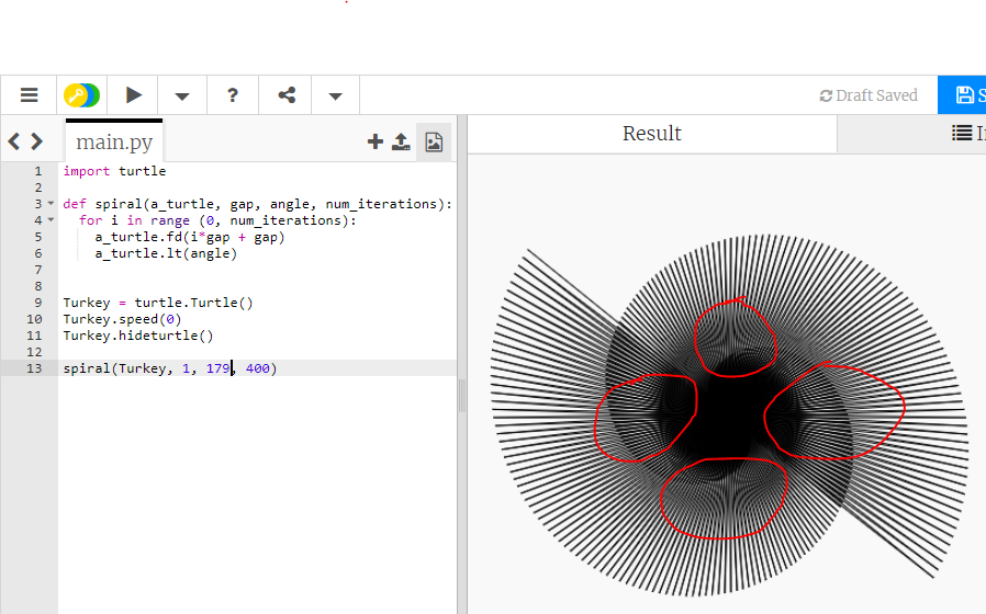 Hey, Yesterday in class some of you saw this: and wondered if it was an optical illusion -- after all, the code does not change the line thickness or the width of the space between the lines. It is not an illusion though, and Alejandro was likely right that this has to do with "jaggies" (that's Dr. Amini's diagnosis). We won't get to interpolation in this class, but if you go on to CS 4550 you will, and also to the related concept of anti-aliasing. I found more strange behavior with this otherwise pretty boring spiral (spiral(Turkey, 1, 90, 400)). The rendering varies according to how you access Trinket (probably different browser views have different CSS styling), and with how fast the turtle moves! Dr. Amini may have more answers on why that is. I mentioned Moire effect yesterday, and I managed to get those to happen with the spiral code. Here is an example -- the parts marked in red pen are where you can see Moire effect: We got a lot out out of few simple lines of code! -- Weronika |