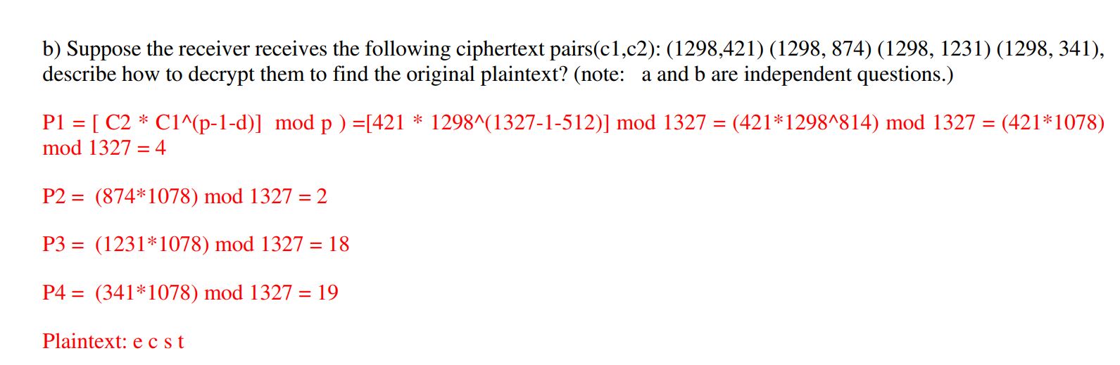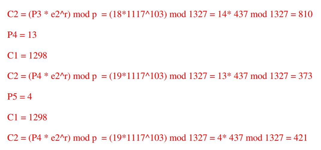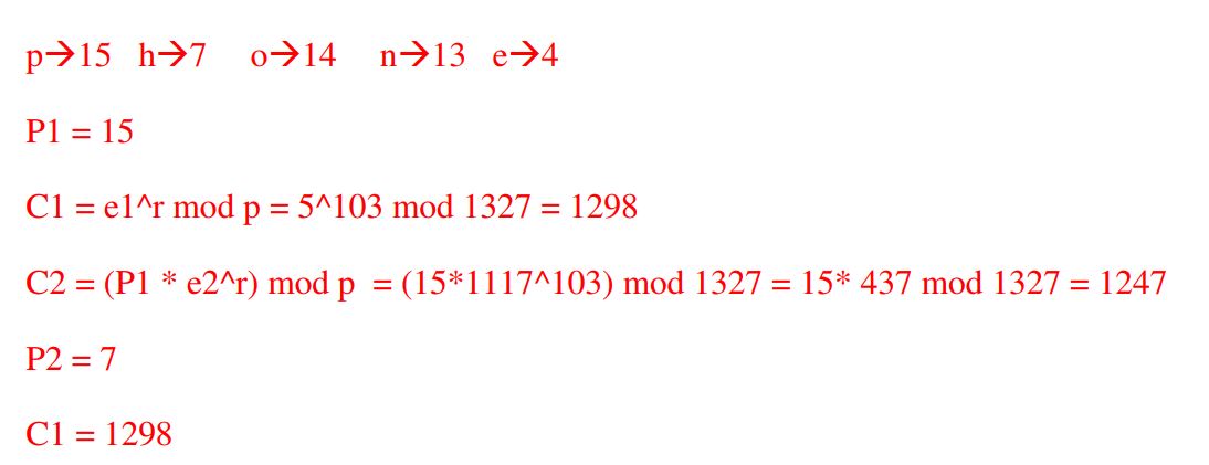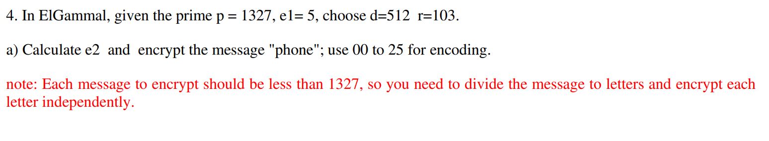 6. In ElGammal, given the prime p = 137, e1= 3 a) Choose d and calculate e2 b) Choose r (it's up to you to decide the value of r) and encrypt the message "happy"; use 00 to 25 for encoding.