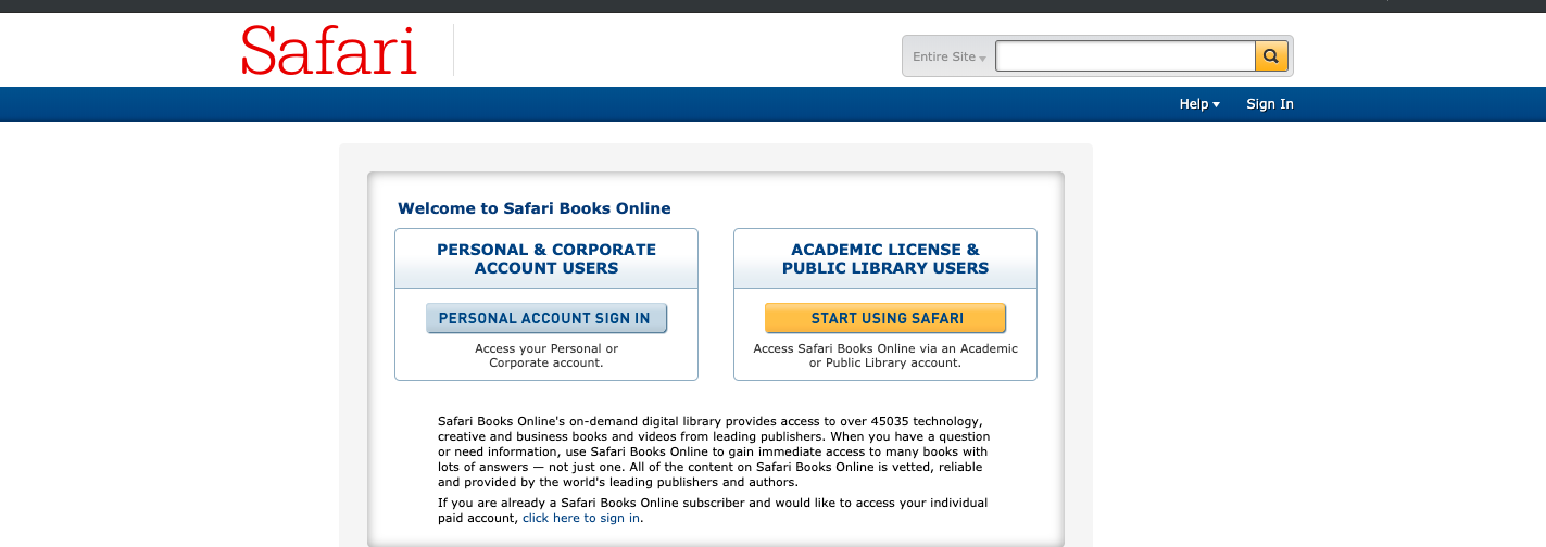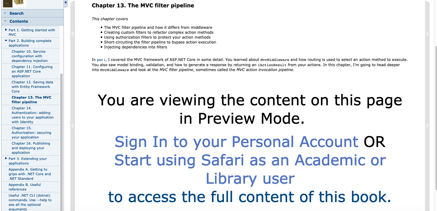 Hi Dr. Sun, I clicked on the link for the Safari Books website and provided my login credentials as expected. I noticed however that after providing my credentials, I'm directed to a page that still asks for a login as a "Personal & Corporate Account" or "Academic License and Public Library User" (see attached photo). I found this strange because just a few weeks ago, that page wasn't there. Anyways, I tried searching for the ASP.NET book through the search bar and was able to obtain it. However, I'm only given a preview and not allowed to see the rest of the content (see other photo). Do you have any suggestions for an alternative way of accessing the book? Thank you. |