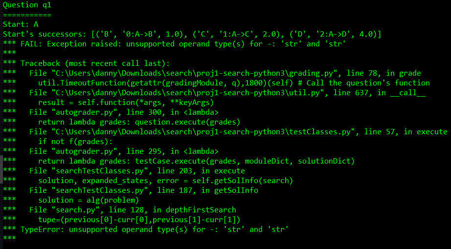 The error message ( It refers to the line where you are creating a tuple by subtraction: Check out that line and see what you are really subtracting. What are the components of The first test case for Q1 is in In this example, the nodes are not points on a grid; they are simply nodes with labels: A, B, C, D, G. Code written to assume that it is always dealing with nodes that are characterized by x-y coordinates stored in a tuple will run into problems. Last edited by rabbott at