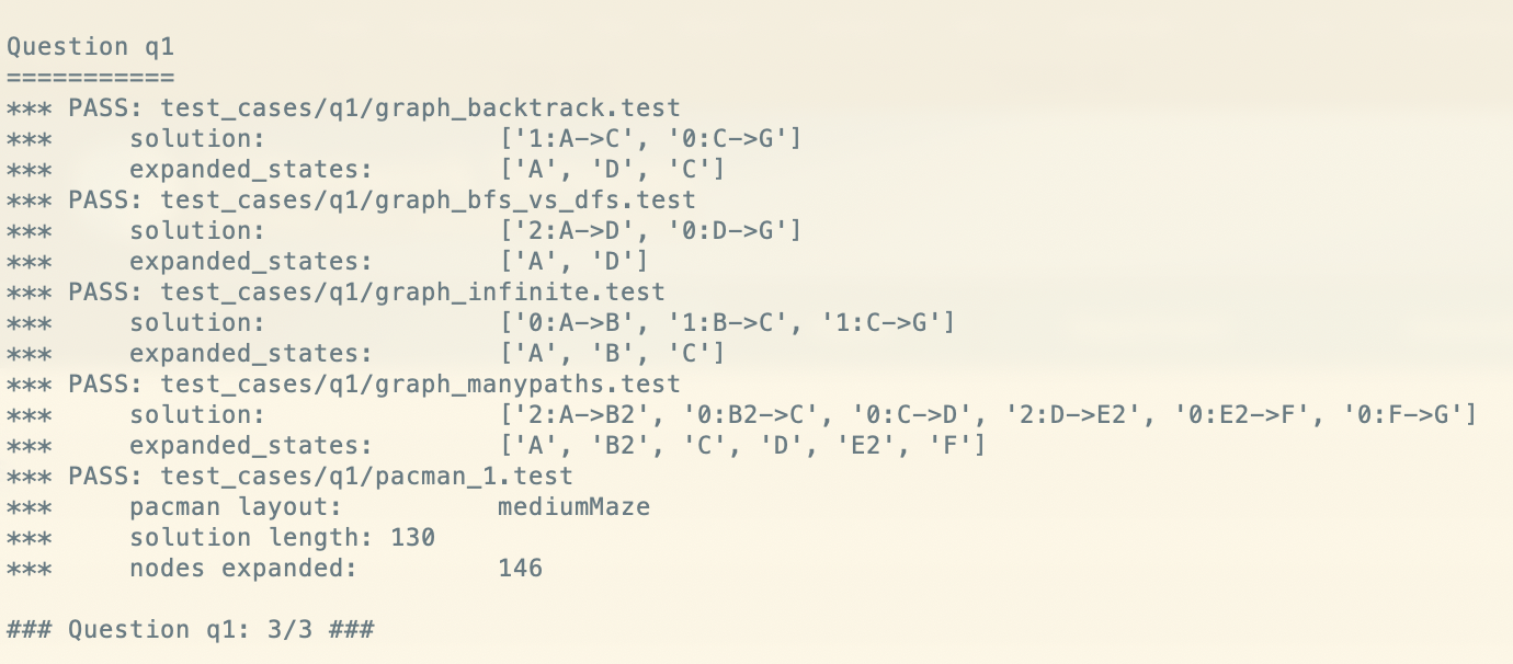 The autograder uses both the pacman game and graph searches to test your code. For example, on small maze, Pacman's starting state: in this case, consists of just a (x, y) coordinate, which is (5,5). The children of this state are ((4,5), 'West', 1) and ((5,4),'South', 1).. which are the only two available children that aren't walls. This is the same as a triple with 3 elements.. (next coordinate as a tuple, direction as a string, and cost as an int) When you add these children to your stack and pop them off, you are changing states from (5,5) to (4,5) or (5,4) - depending on your search or tie-breaking. With the Graph search, the state is represented with just a character 'A' or 'B'.. etc. instead of a coordinate (5,4). Using the graph_backtrack.test, If you start off with 'A', you look at its children.. (('B', '0:A->B', 1.0), ('C', '1:A->C',2.0), ('D', '2:A->D', 4.0)).. It's in the same format as a triple with 3 elements.. (simply a char as state, direction as string, and cost as double), so your DFS should be able to handle the graph search as well.