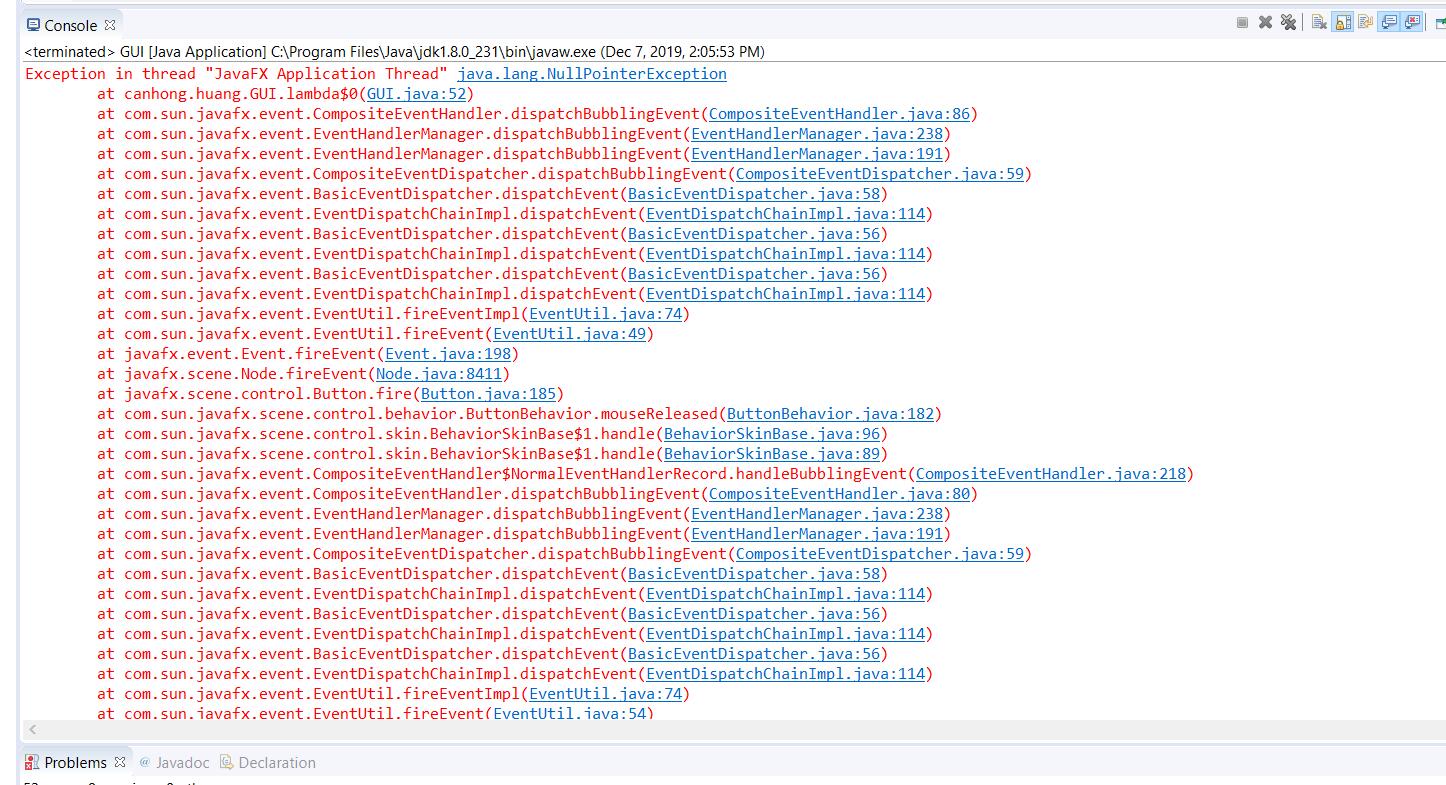 Prof. Keenan, I don't know why a NullPointerException occur when I click cancel button of the file chooser. I use try-catch box and I put the button.setOnAction inside the try box and I catch the nullpointerException. But the exception still appears in the console. |