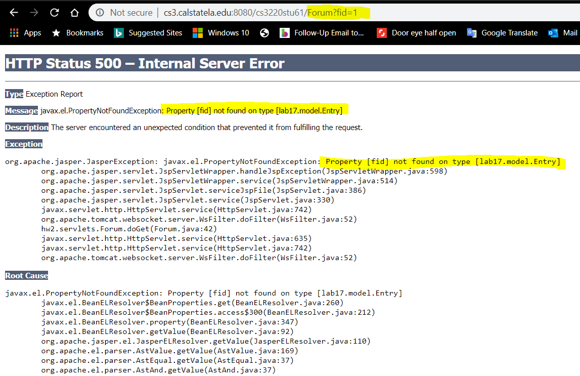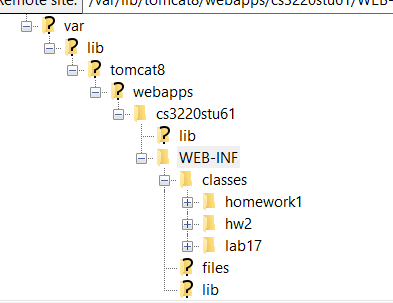 Thanks sir. But somehow, my projects aren't stable when running on the server. I also get an error in my Homework2 which whos the error is in Lab17 code. they are kind of mixing up. when I overwrite the web.xml and run homework2, it works fine.But when I run my Lab17 code and go back to Homework2 to re-run, homework2 throws an error. I have attached a screenshot of my classes in CS3 and a screenshot of the error I am getting.