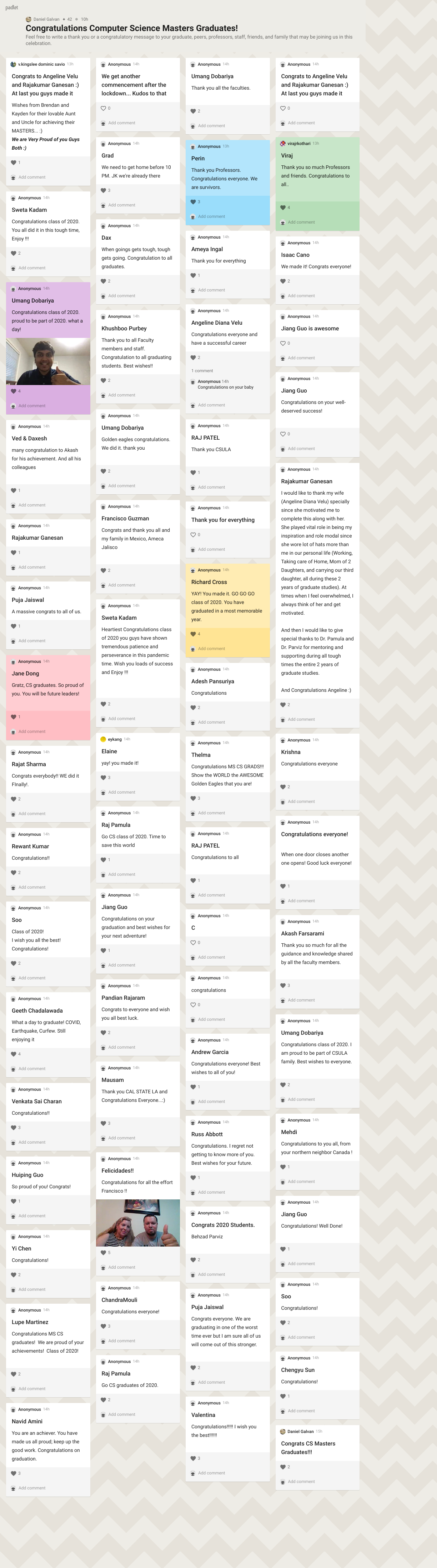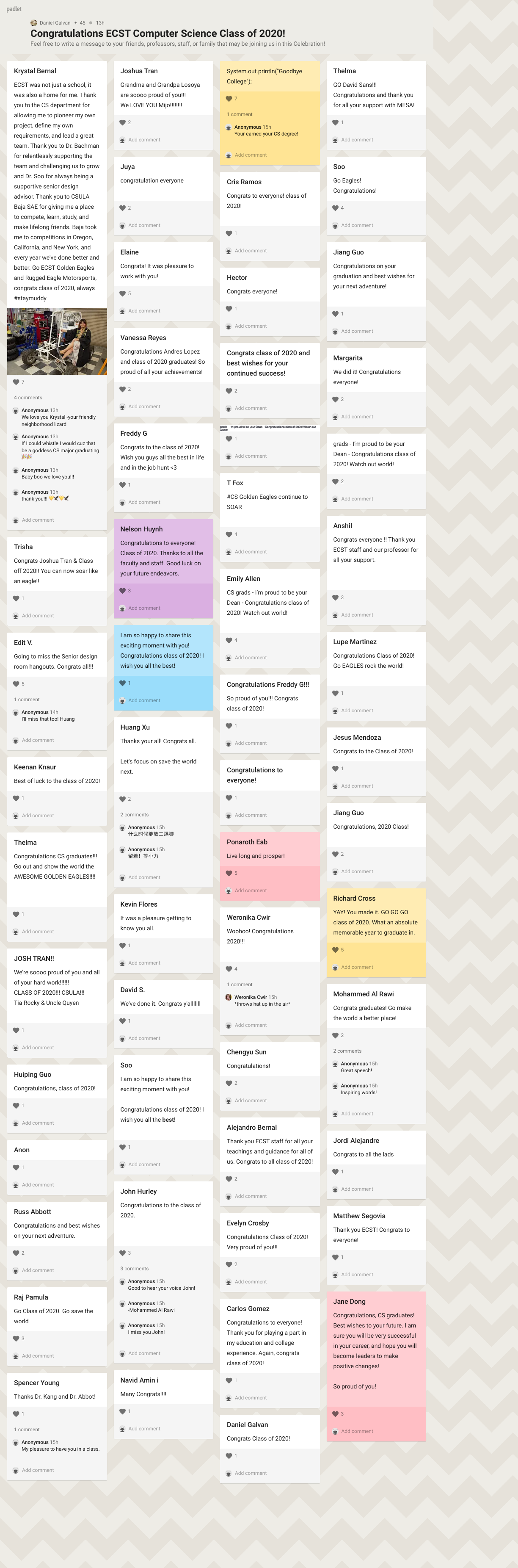 The CS department hosted two celebration events for CS Class of 2020 on Wed, June 3rd, 2020. The event was NOT Commencement, nor was it intended to take the place of Commencement. This event was a department recognition. Here are the links to the event videos: Undergrad event: Grad event: Also, see two Padlet activity images in the attachment. You can still participate in the college online yearbook - LINK: https://calstatela.brightcrowd.com/ecst2020 (passcode was sent via email to the class of 2020.) Congratulations! Last edited by eykang at