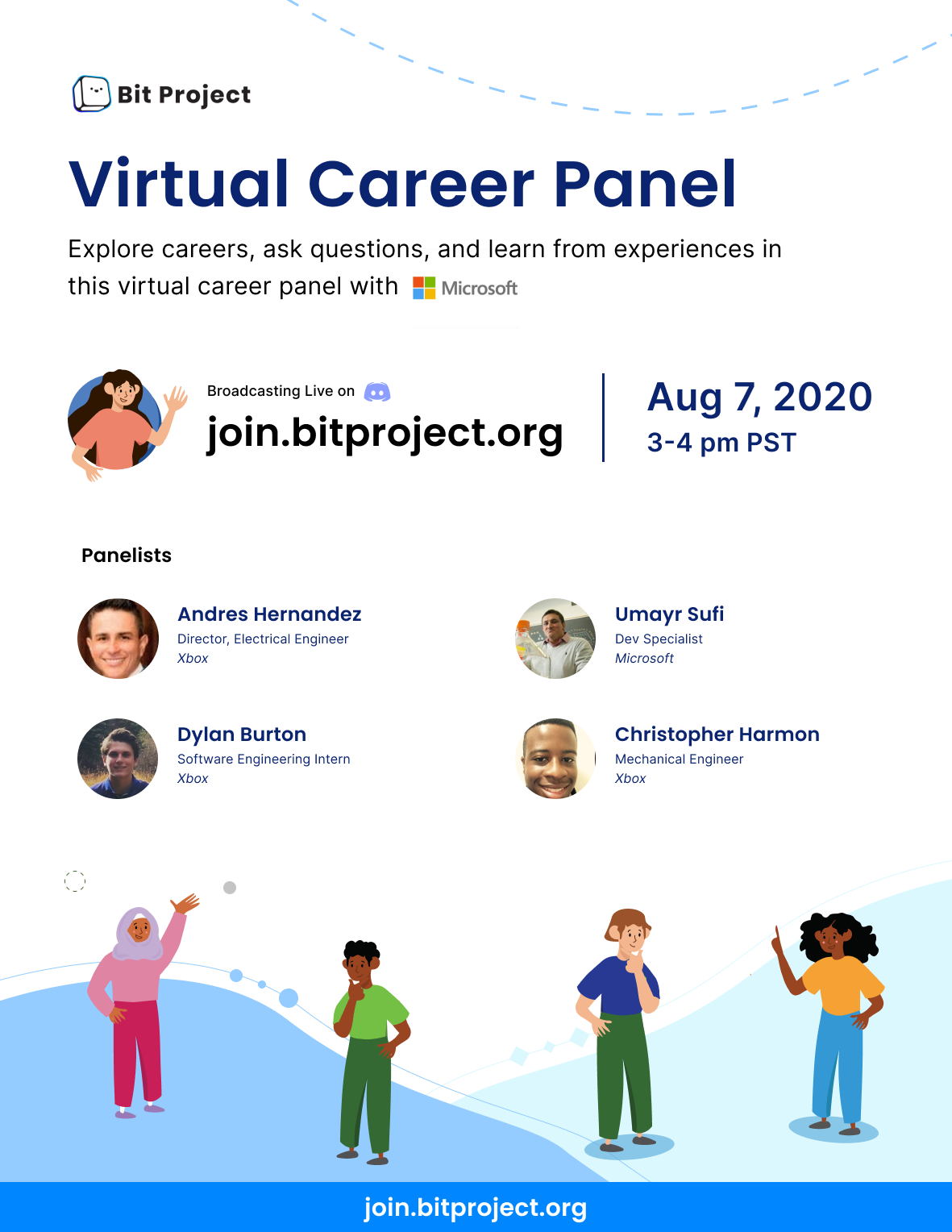Hi, My name is Rae Han and I’m currently a sophomore at the University of Southern California. I am reaching out to you on behalf of Bit Project (bitproject.org), which is an open-source, fully remote student initiative to make developer education more accessible to prepare students to enter the tech industry. We wanted to invite CS students at your university to join our Virtual Career Panel hosted with Microsoft on Friday, August 7th at 3:00 PM PST. Our guest speakers work in diverse fields across Microsoft including electrical, software, and mechanical engineering as well as community development and will be sharing their experiences working for the company and how they have gotten to where they are in their careers today. They will also be taking questions from the audience and giving tips on getting involved in the tech industry. This is a great opportunity for students to network with tech industry professionals and asks questions about industry jobs and job search. I have attached the event flyer below which includes the link to join the Bit Project Discord where we will be sending the direct link to the event later this week. Please feel free to share this with your students and let me know if you have any questions. Thank you, Rae Han |