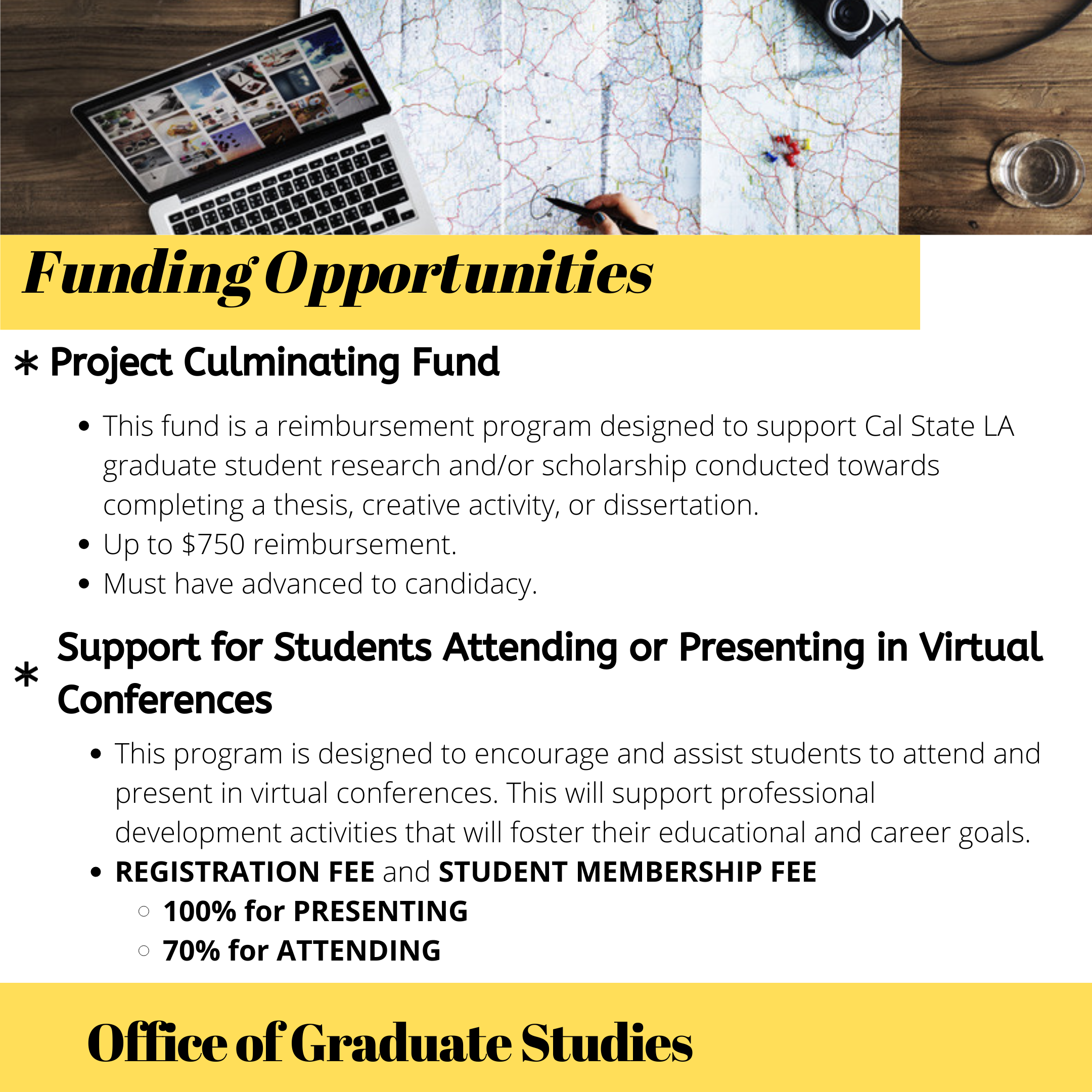 Support for Students Attending or Presenting at Virtual Conferences This is a reimbursement program designed to encourage and assist Cal State LA graduate students whose work has been accepted into a professional/academic conference. It is also intended to promote and help Cal State LA graduate students participate in professional development activities to foster their educational and career goals. Initially, we offer 50% reimbursement for attending and 70% reimbursement for presenting for travel support. This semester, since all conferences will be virtual, we will be offering ATTENDING- 70% PRESENTING-100% reimbursement for REGISTRATION FEE and STUDENT MEMBERSHIP FEE. Thank you! Best, Ledi
