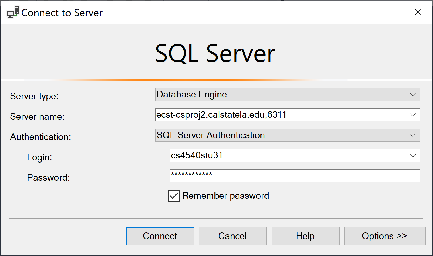 Connection Using MS SQL Server Management Studio (SSMS)You should replace cs4540stu31 and the password with your own username and password. Connection Using Azure Data Studio (ADS)Connection Using sqlcmd> sqlcmd -S cs3.calstatela.edu -U <username> -d <database> You can see the list of command line options by typing sqlcmd -?